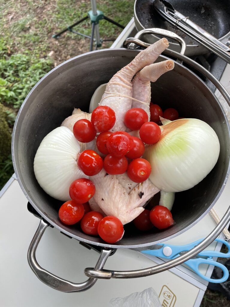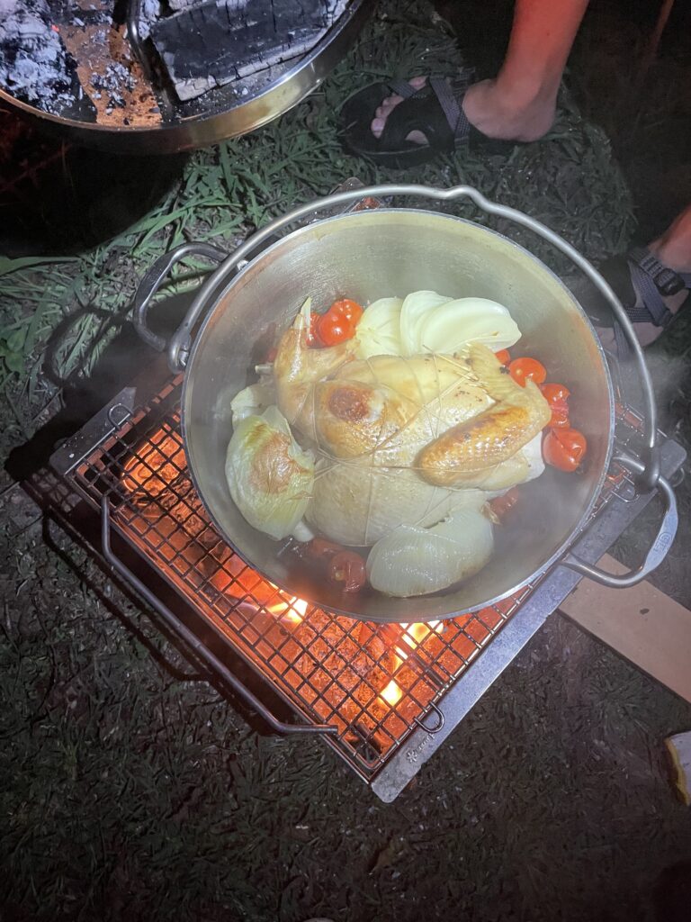 現地での楽しみの1つは食事です。焚火でバウムクーヘンを作ったり、トウモロコシを直火焼きしたり、丸鶏にご飯を詰めてダッチオーブンで蒸し焼きにしたりしています。冬はソロキャン、夏秋はグルキャンで行くことが多いです。